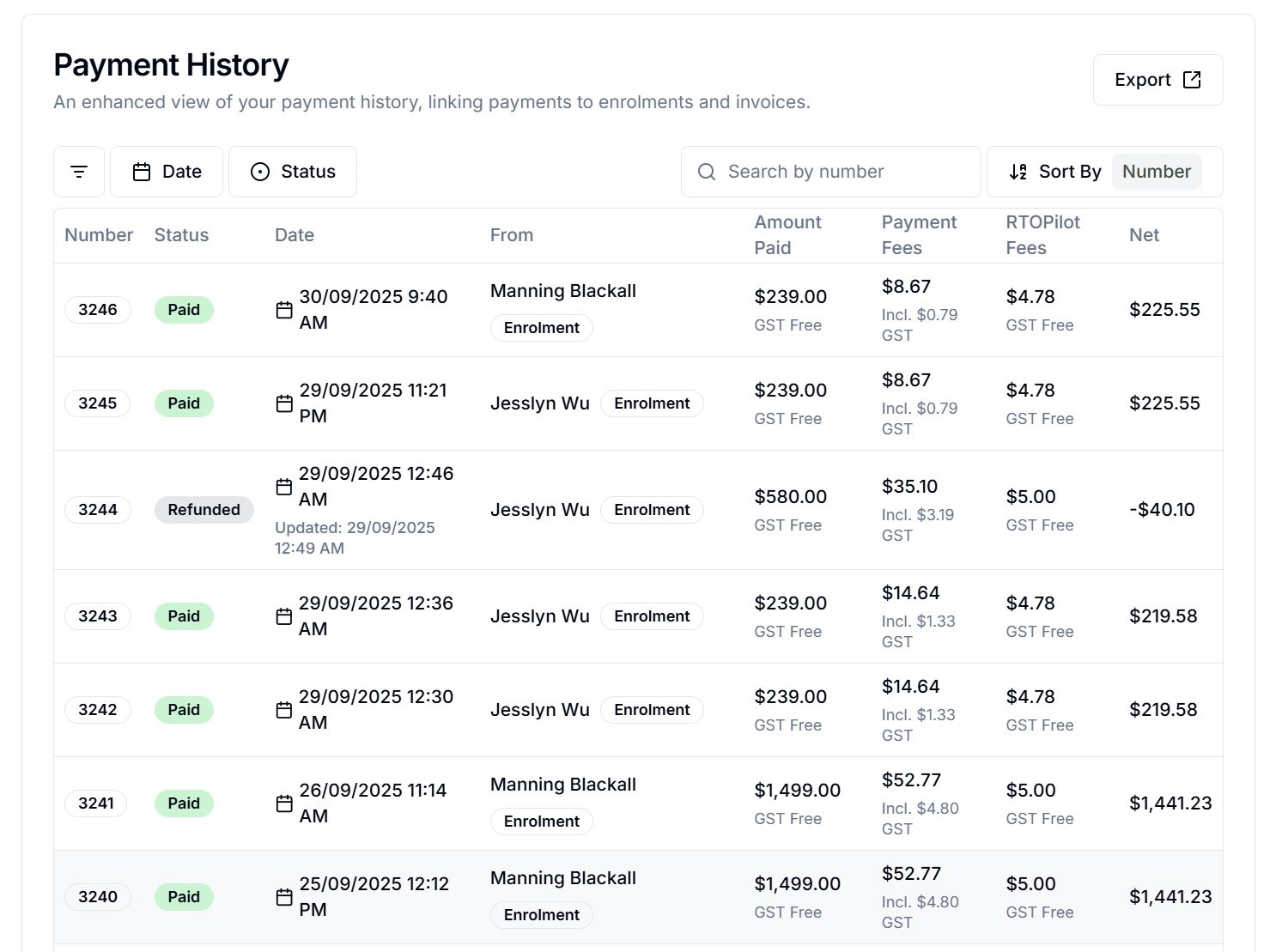 The payments view has been streamlined to show related operations (fees, refunds, adjustments) as updates to existing rows rather than creating separate entries. This significantly reduces clutter and makes it easier to track the full lifecycle of each transaction.